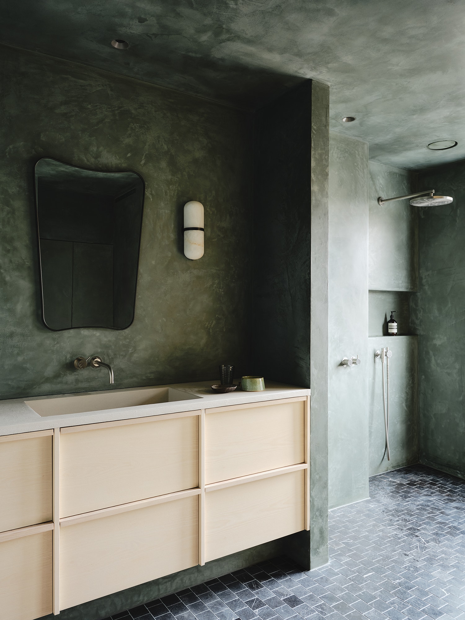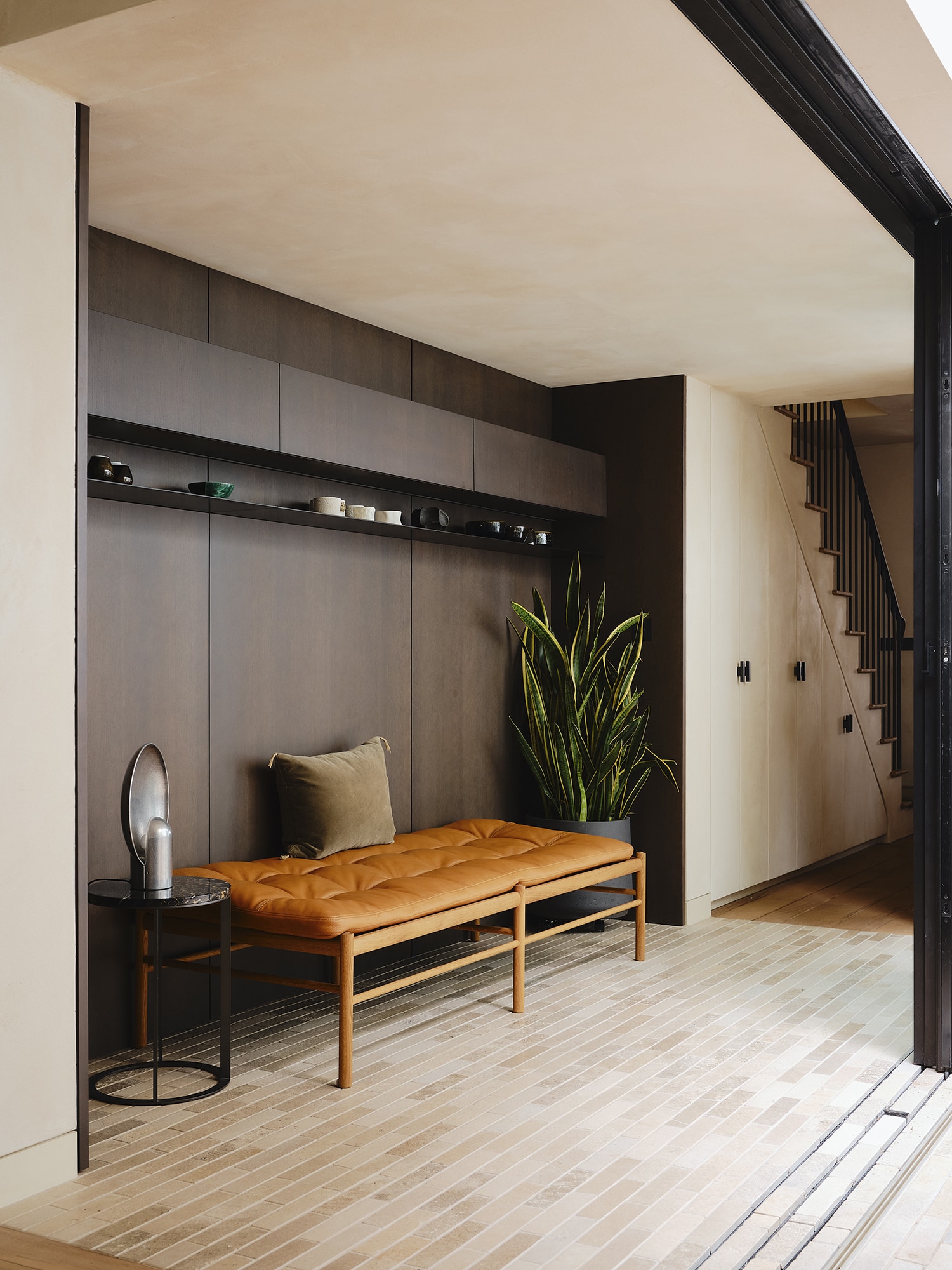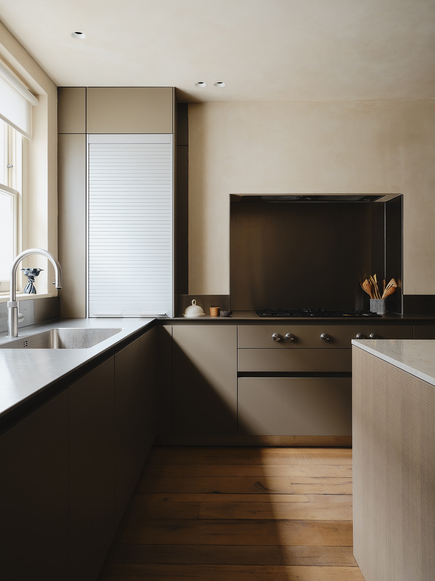 Materials were carefully chosen: antique timber flooring reclaimed from a French château, clay walls, tadelakt and raised-grain timbers — all bringing depth and a sense of imperfection that defines the home’s character.