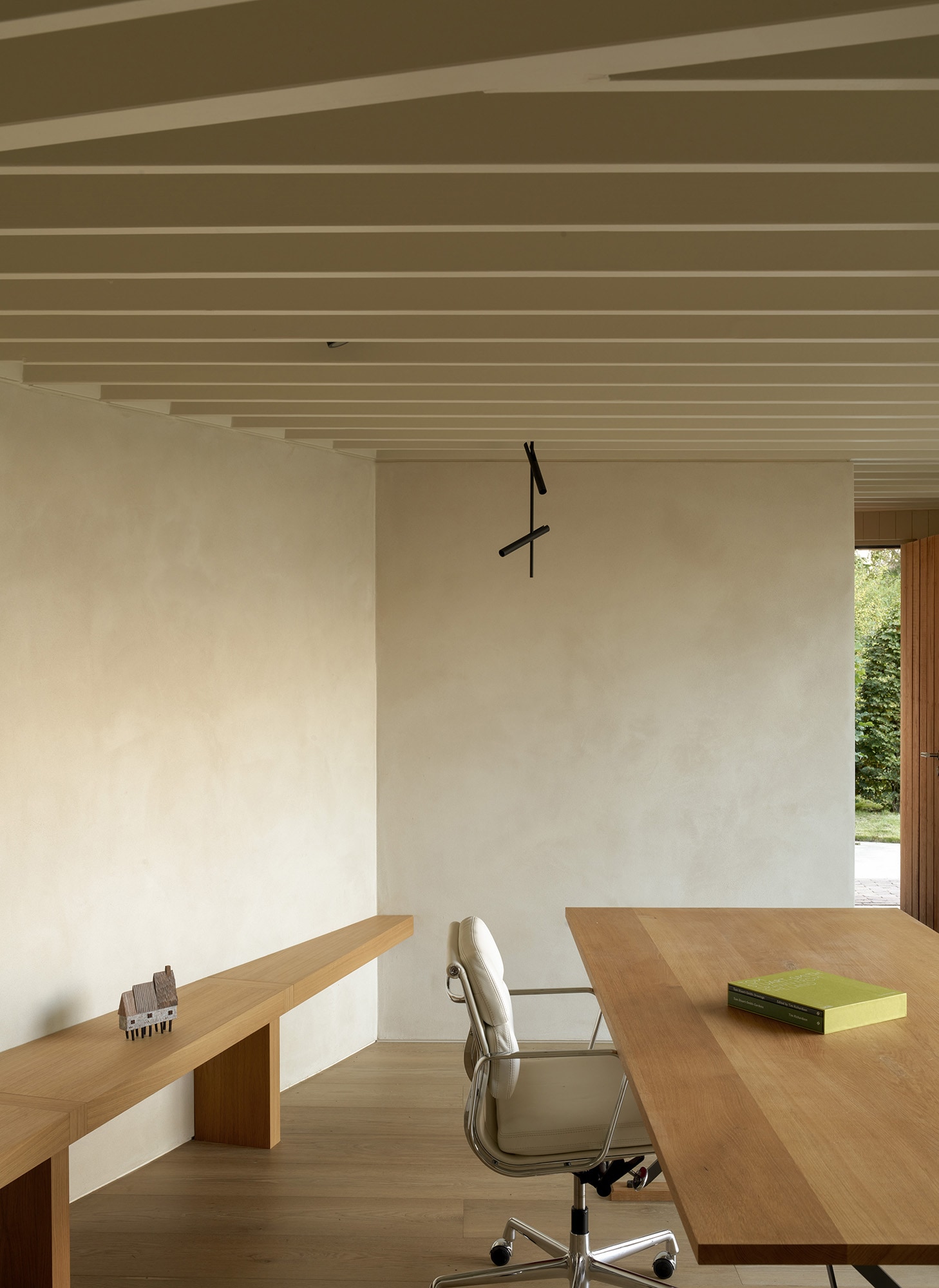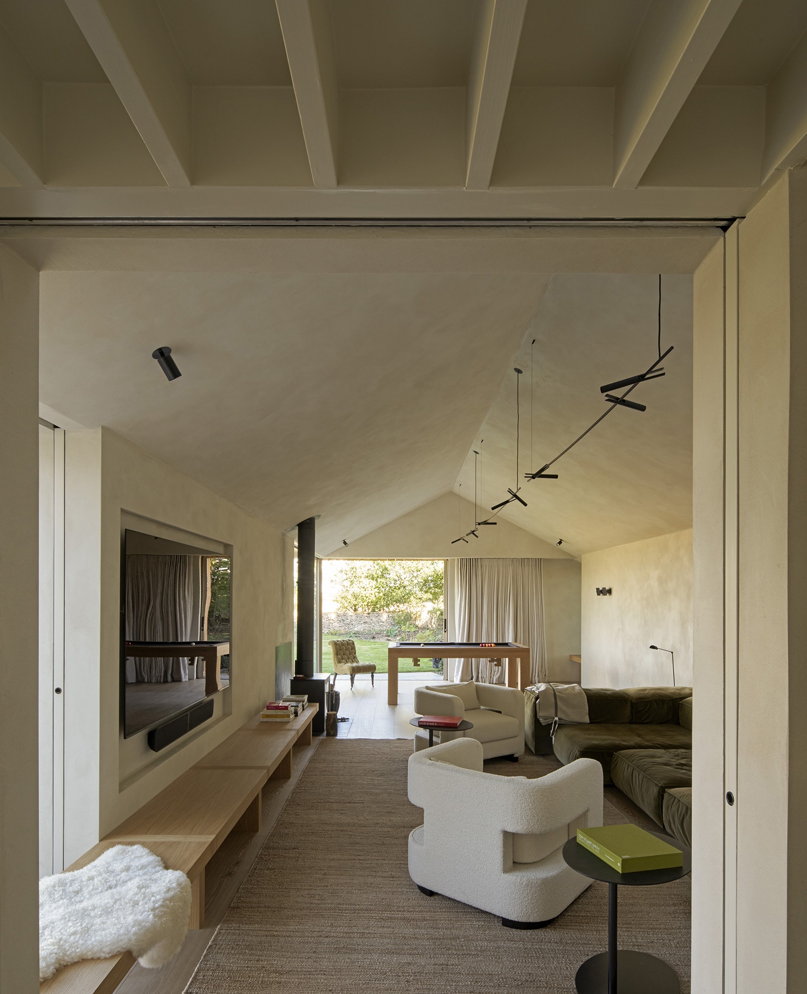 Drawing from the area’s agricultural character, the palette features timber cladding and corrugated steel — materials that root the building in local typology. Large elements of glazing and crisp detailing elevate the structure, while natural finishes and soft tones create a serene interior.
